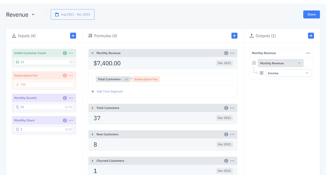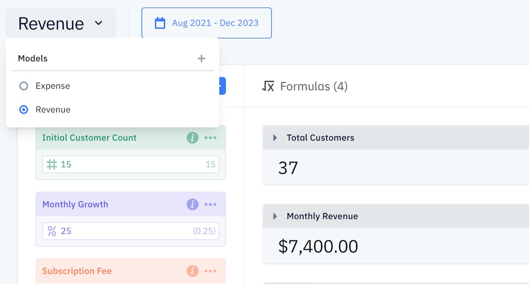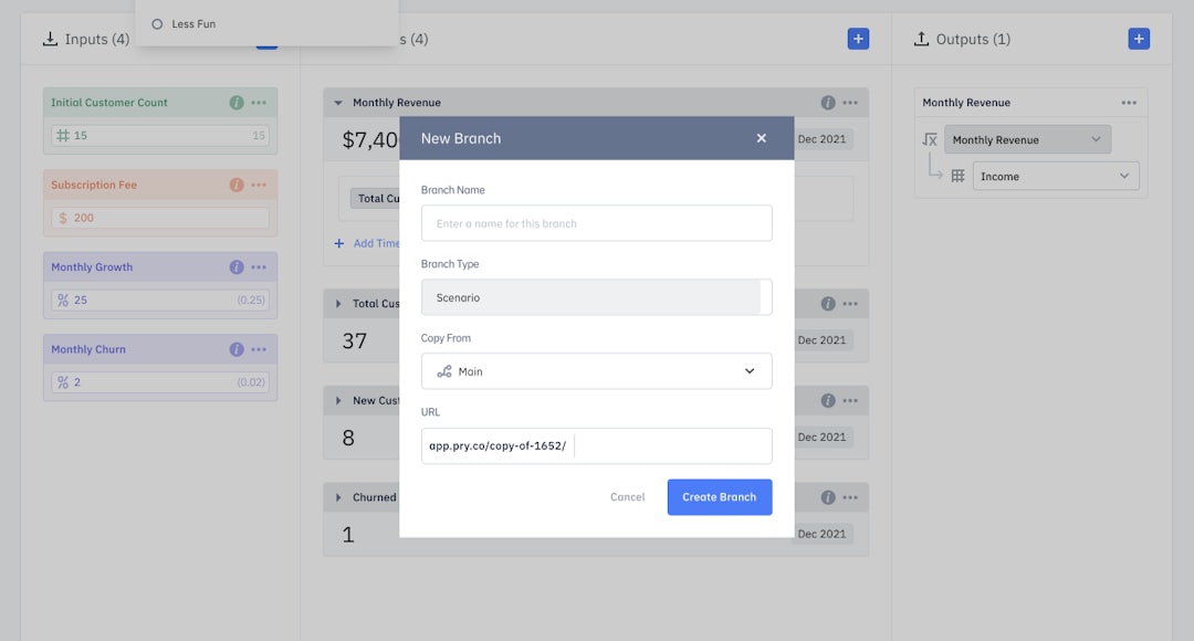 In Pry, this process is more intuitive and easier to replicate. Pry provides pre-built functions and default formulas (e.g., projected revenue = number of customers * monthly contract value). Then you can customize, add, and delete inputs and formulas as needed.