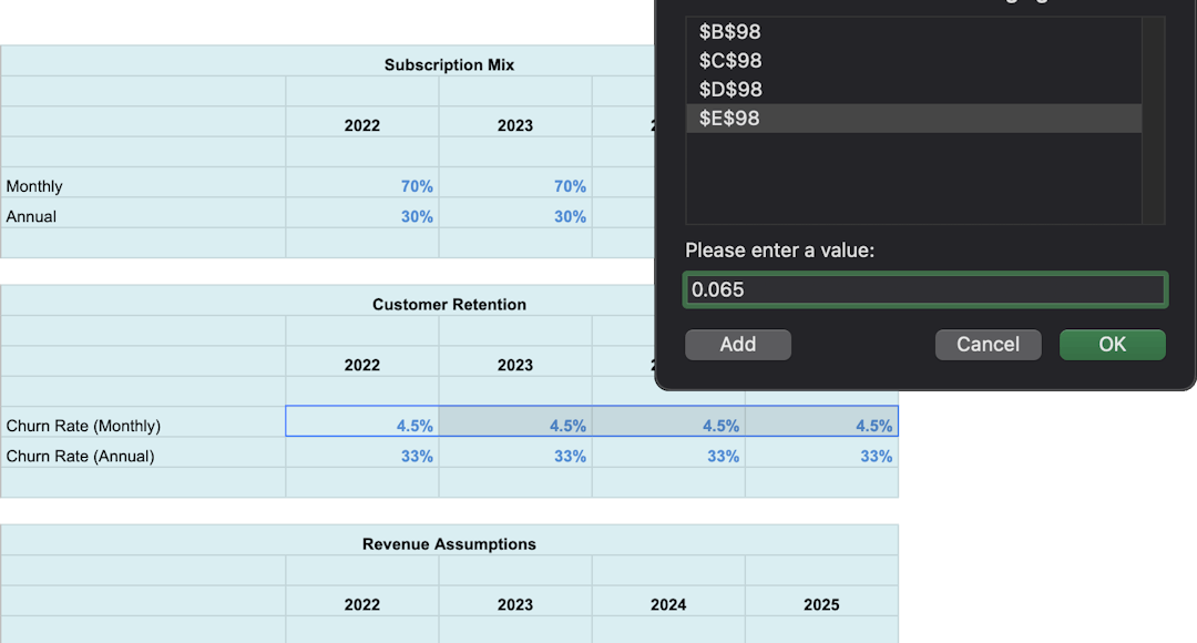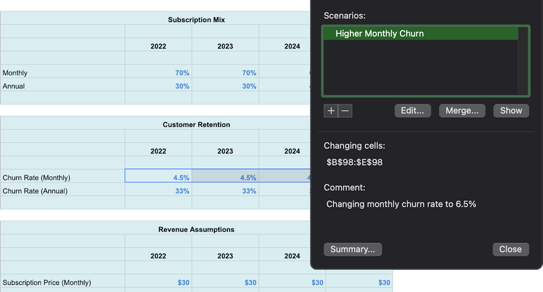 When the Scenario Values dialog box comes up, you should change one or more variables that are appropriate for the scenario you are trying to build. For example, if you are building a best-case scenario for a subscription revenue model, you will want to increase the monthly growth rate percentage.