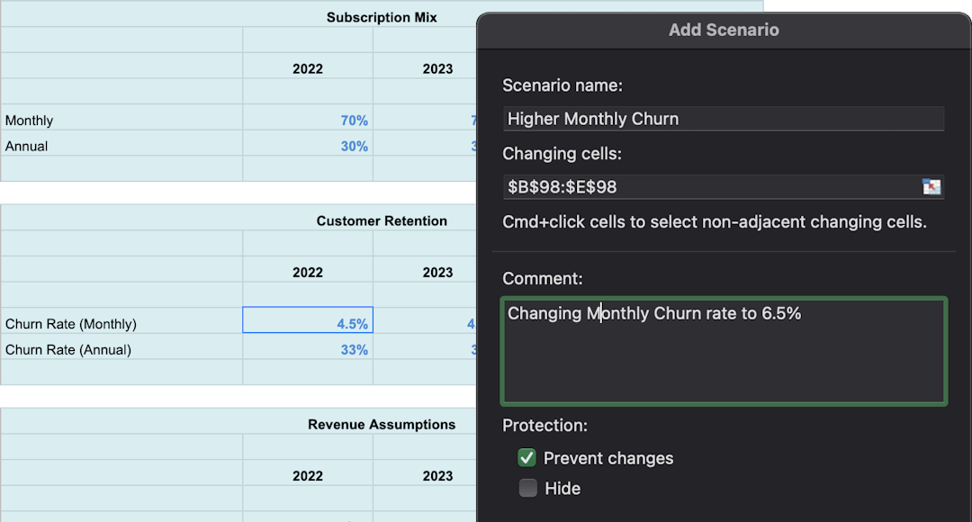 In Excel, you can create new scenarios the same way you saved your original. On the Data tab, select “What If Analysis,” then “Scenario Manager," and then "Add." Leave the "Changing cells" field the same as your original because your formulas will reference that same data. Then create a new Scenario Name and add any relevant details in the Comment field.