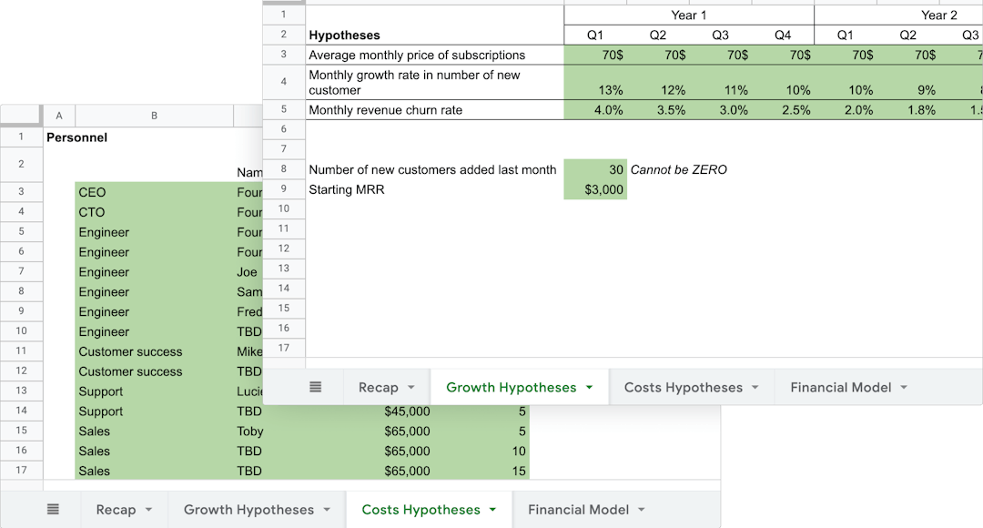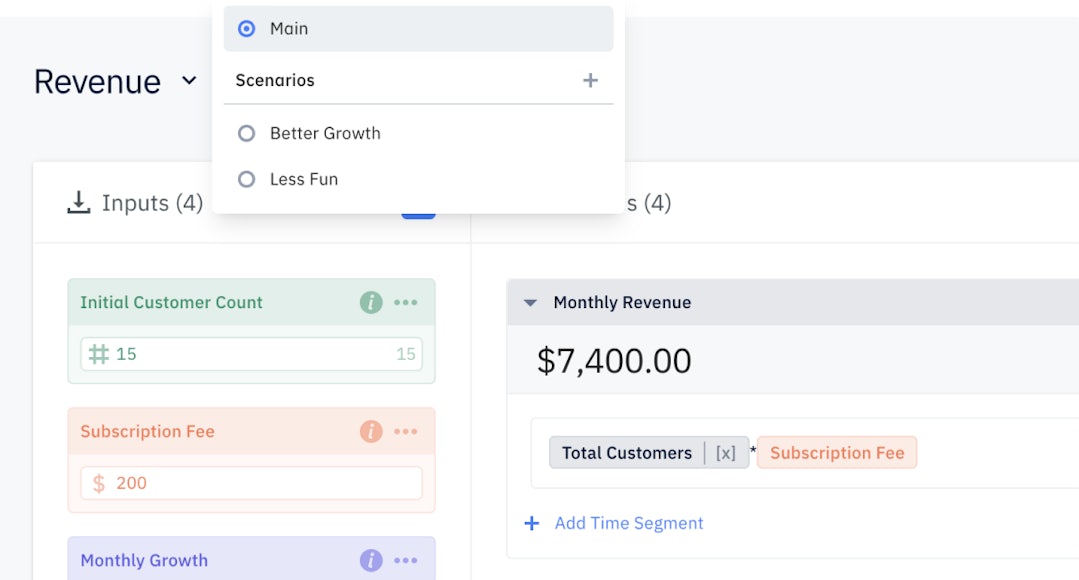 If you don’t know where to begin, start by changing something that you already know affects the variable you want to predict. For example, if you’re trying to predict how you could increase MRR, start playing with the monthly new customer growth rate.