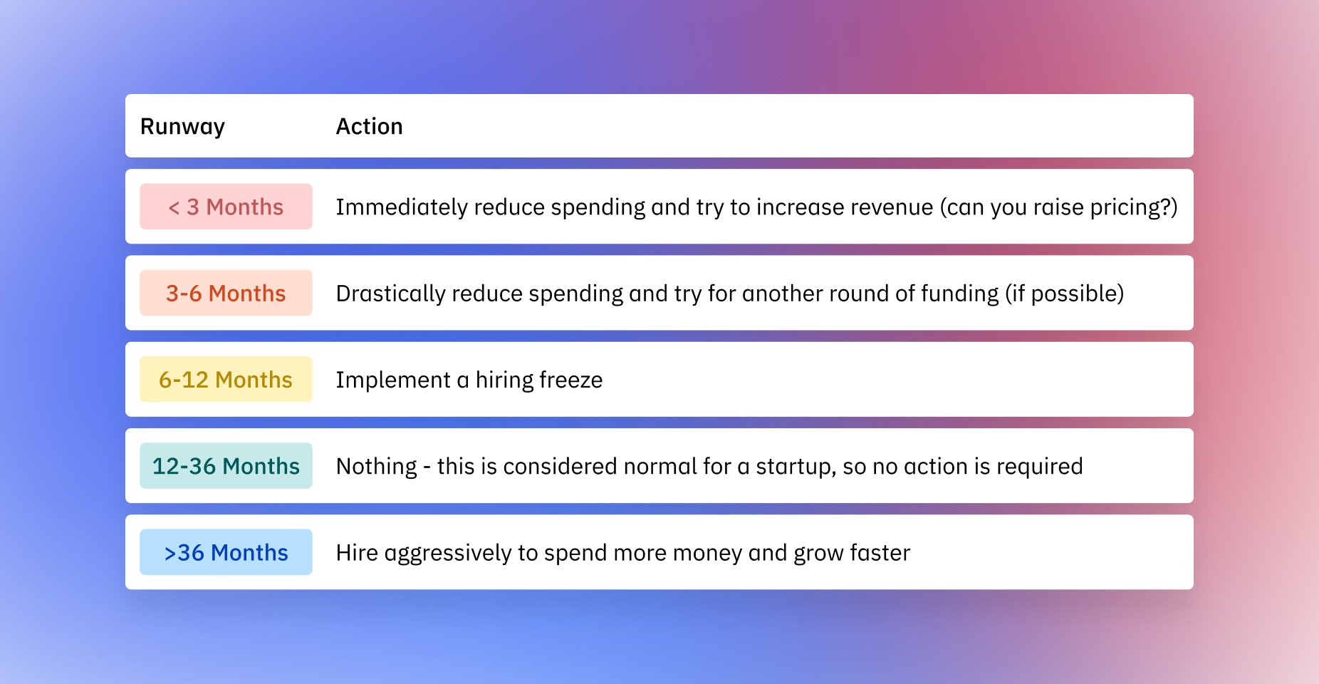If you know your runway will end in a couple of months, you obviously need to do something. You don’t want your company to crash and burn, and every potential investor will ask you about it. So you should be comfortable calculating and discussing your runway at any time.