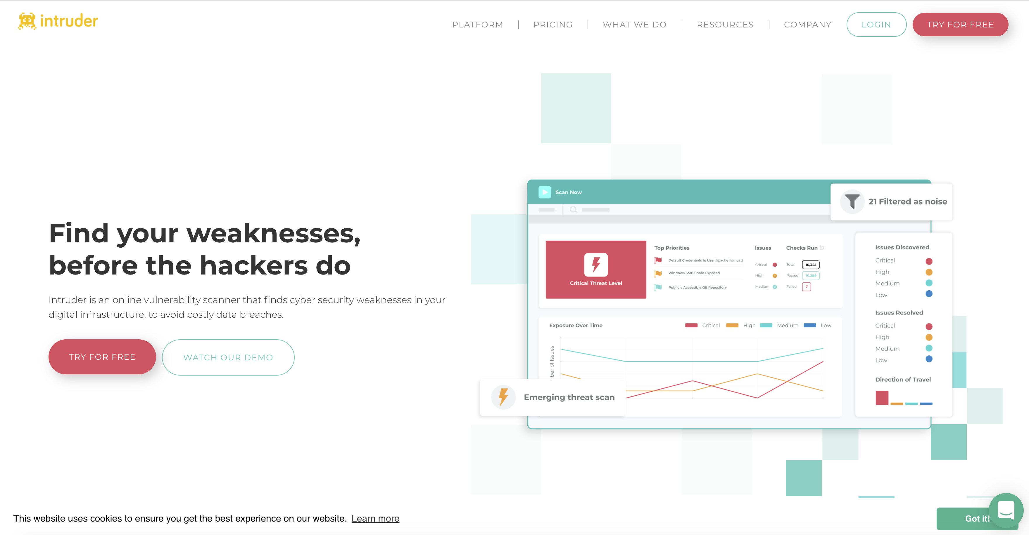 Intruder is a one-stop-shop vulnerability scanner that finds weaknesses before hackers can exploit them. Intruder works across environments. It scans against threats from the internet, but it also looks internally for security holes like missing patches or flawed encryption.