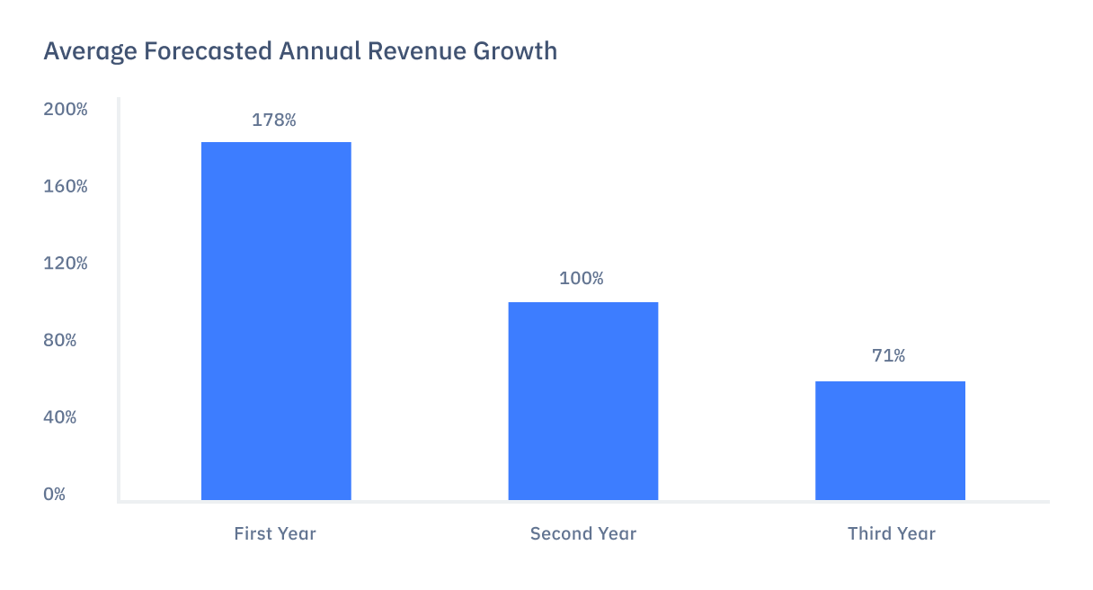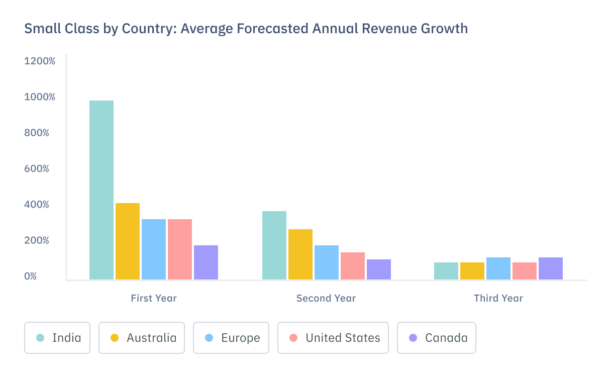 Keep in mind that averages can vary wildly by size and location. For example, smaller companies with $50,000-$250,000 in annual revenue typically forecast a higher growth rate than larger companies. And companies in India forecast a much higher growth rate in their first year (970%) compared with Australian companies (400%).