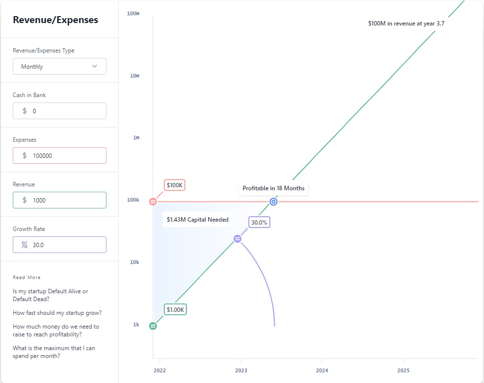 Pry’s startup growth calculator can help you quickly create a growth strategy by answering questions, like “How fast can we afford to grow without running out of money?" You can enter your current cash balance, existing expenses, recurring revenue, and MoM revenue growth rate. Or you can play with the numbers by sliding the handles around until you reach your target revenue.