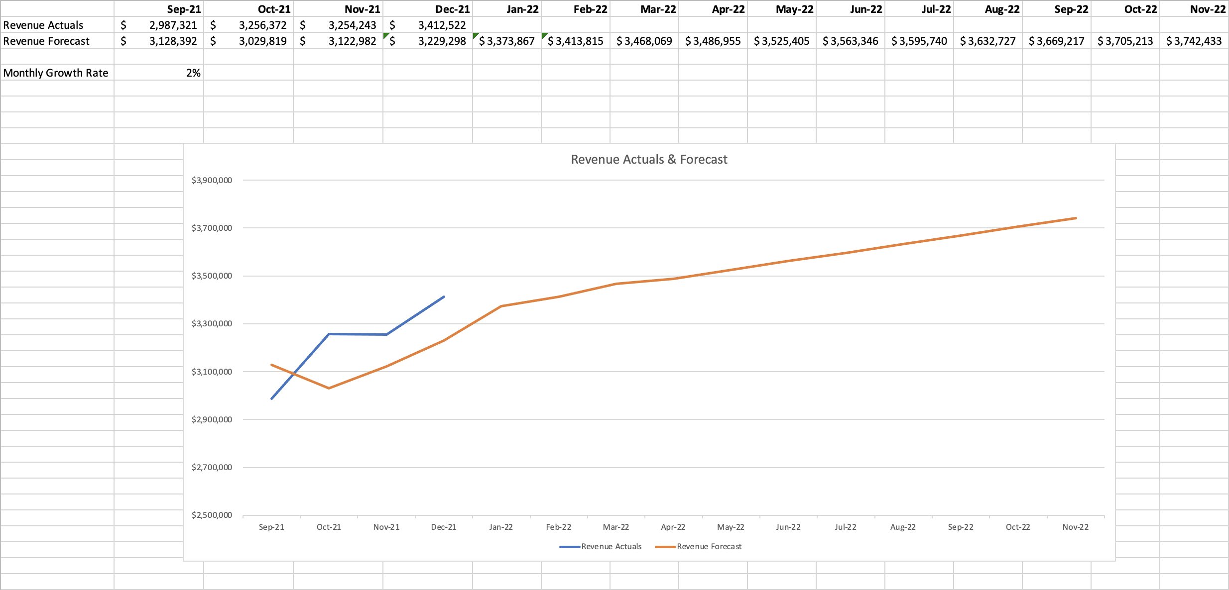 Once you have a realistic revenue forecast and it’s displayed visually, the next step is to continually update it based on current data. Do you have new products? Update your forecast with those sales numbers. New hires on the sales team? Update your forecast with those expenses. At a minimum, you should update your revenue forecast monthly. If you hire a CFO, they should update your forecast every two weeks.