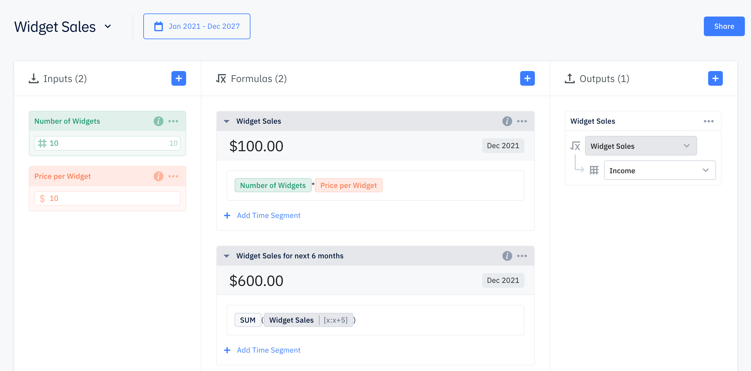 Here’s an example: if you’re currently selling 10 widgets per month at $10 per widget, and you expect to do that for the next six months, you can forecast that your revenue will be $600 by the end of those six months (10 widget x $10 x 6 months=$600 revenue).