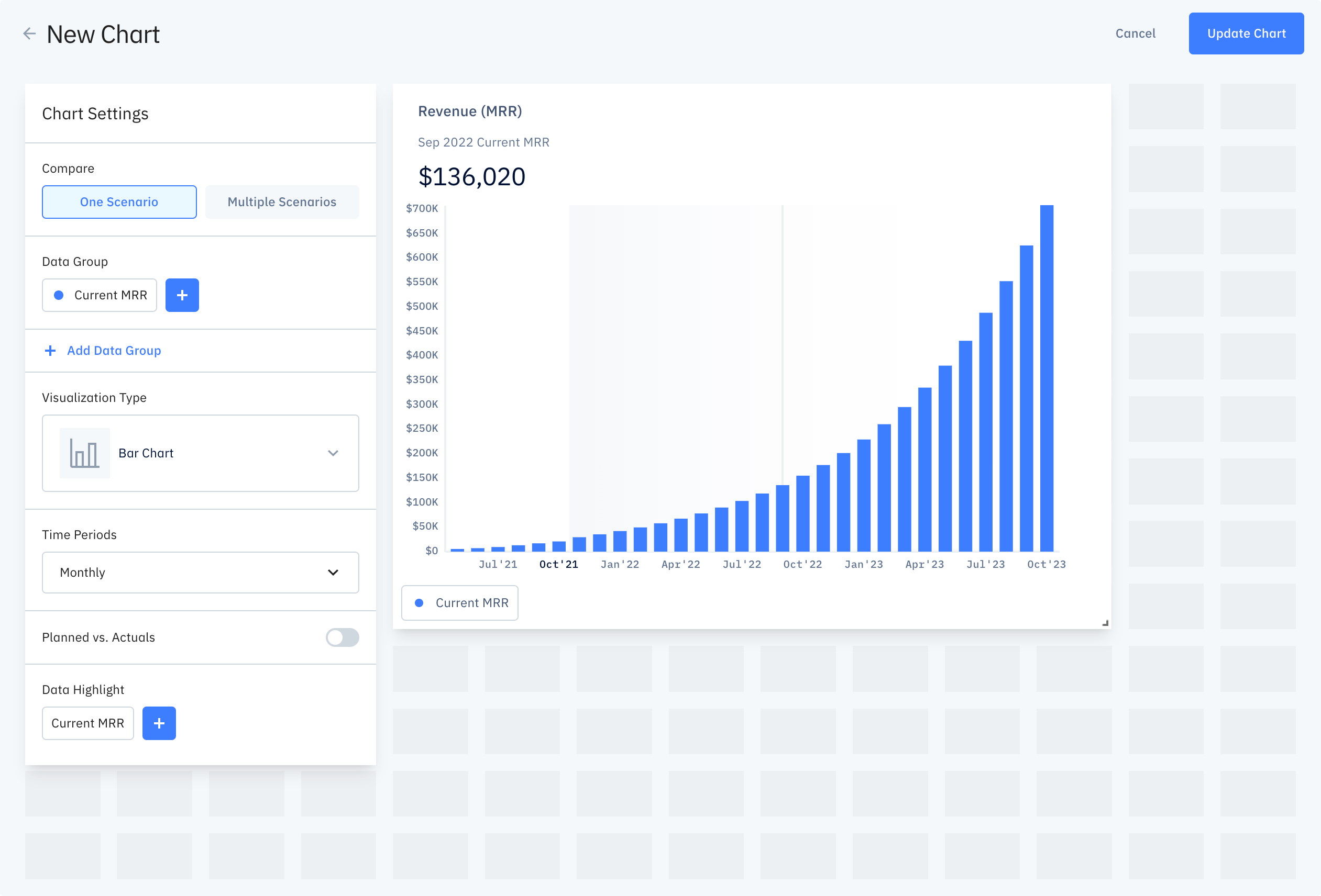 If it’s challenging to troubleshoot Excel formulas and trendlines (or you don’t want to hire an analyst to do it for you), you can try out a financial planning software like Pry. With Pry, you can easily create a bar chart to show your company’s monthly revenue forecast: