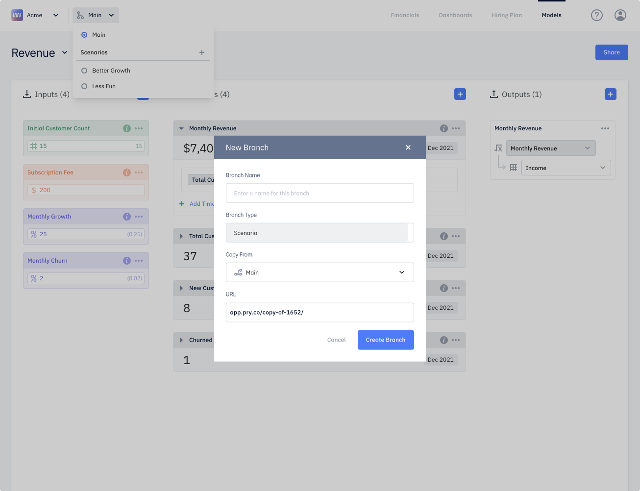 In Pry, you can create new scenarios by selecting the + icon from the dropdown. When the New Branch dialog box comes up, name your scenario in the Branch Name field and select Create Branch.