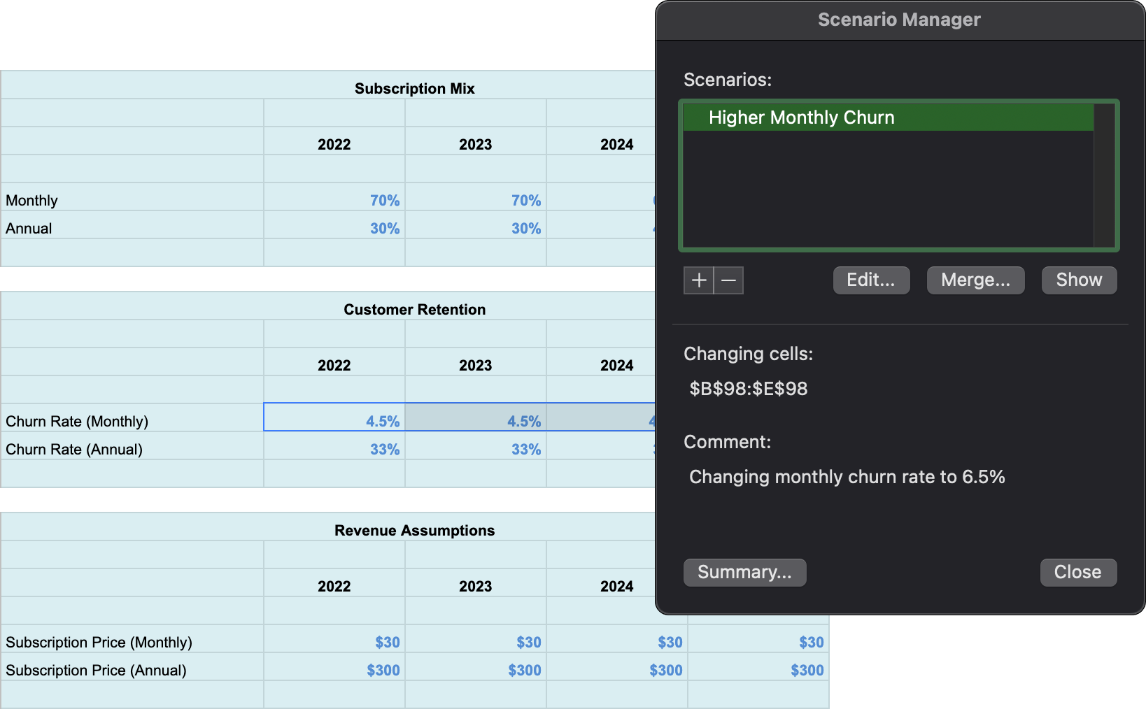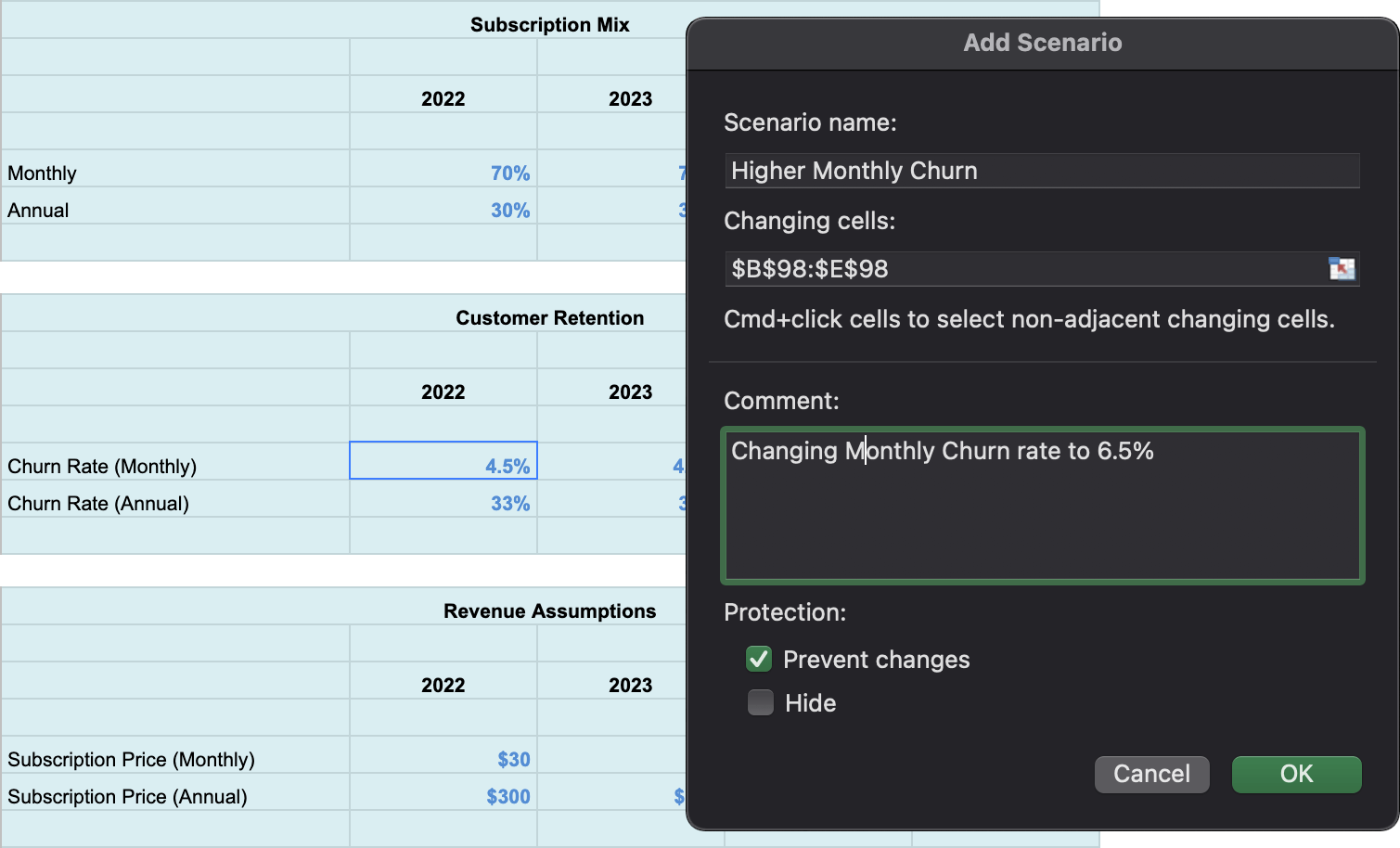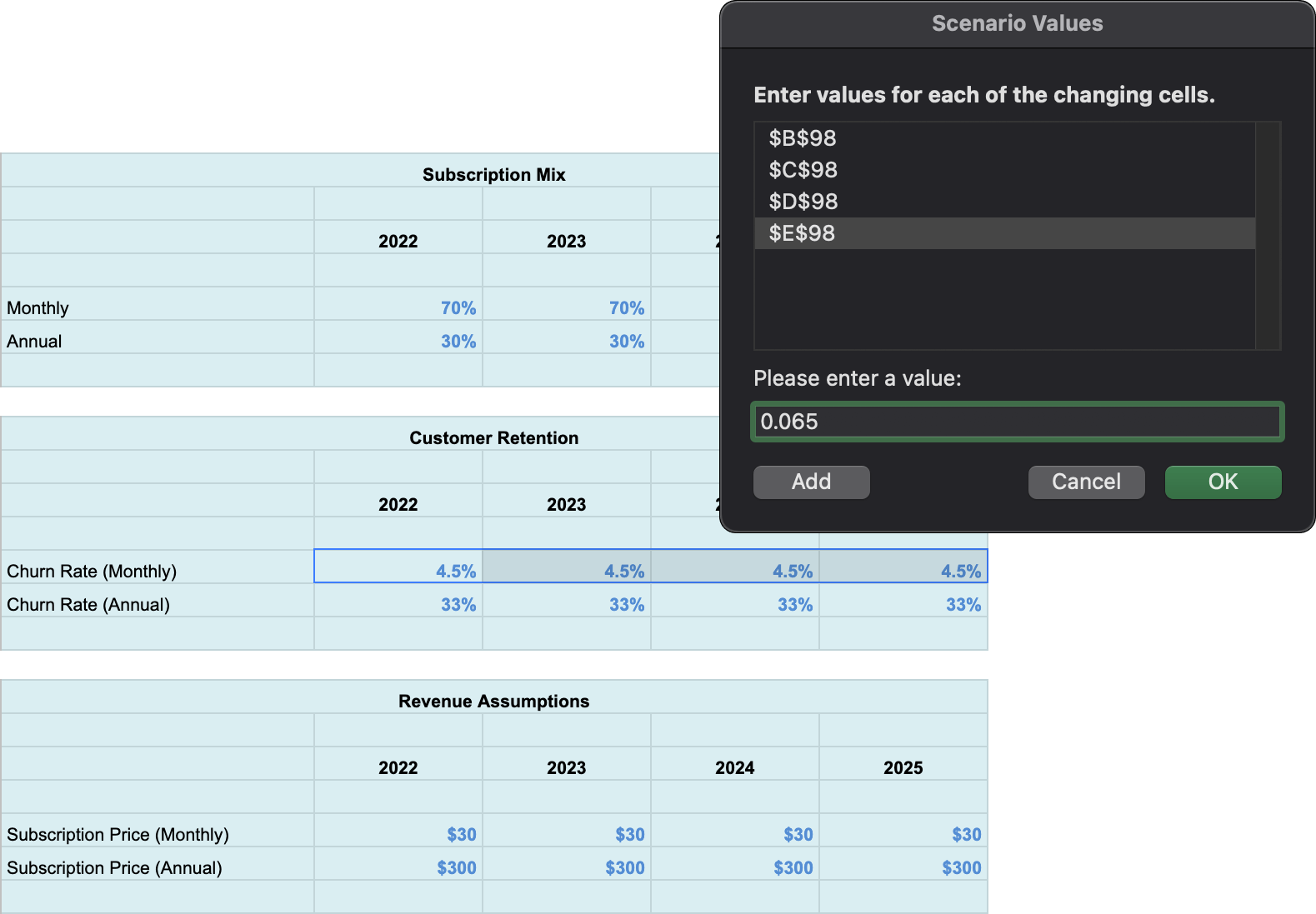 When the Scenario Values dialog box comes up, you should change one or more variables that are appropriate for the scenario you are trying to build. For example, if you are building a best-case scenario for a subscription revenue model, you will want to increase the monthly growth rate percentage.