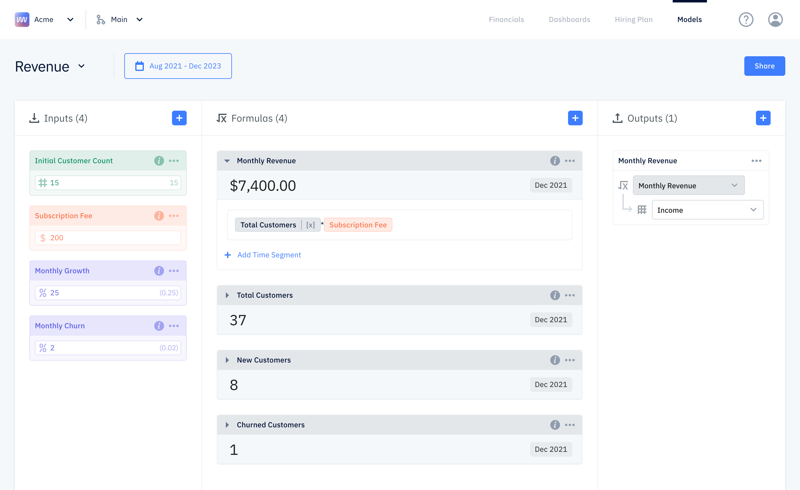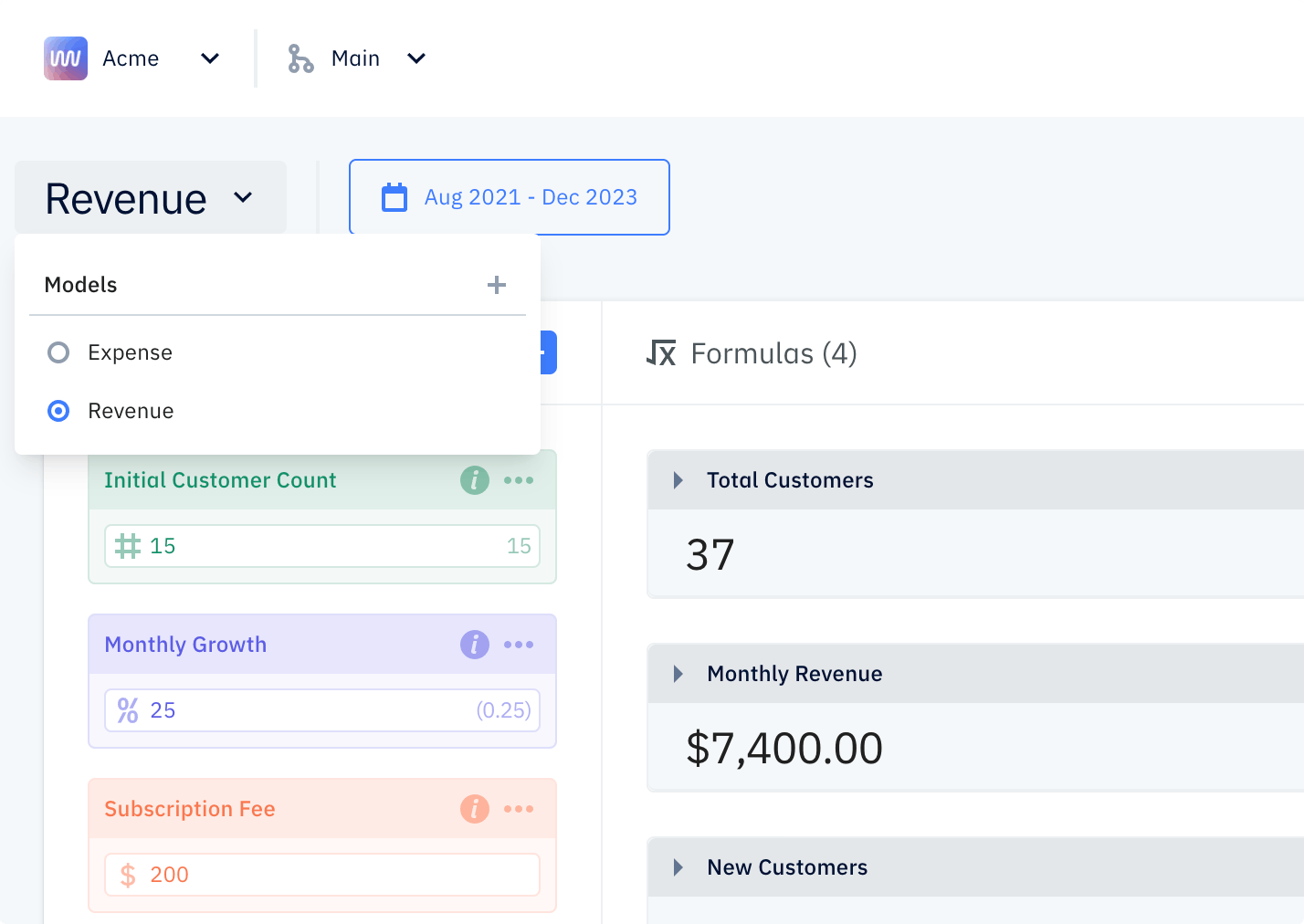 In Pry, this process is more intuitive and easier to replicate. Pry provides pre-built functions and default formulas (e.g., projected revenue = number of customers * monthly contract value). Then you can customize, add, and delete inputs and formulas as needed.
