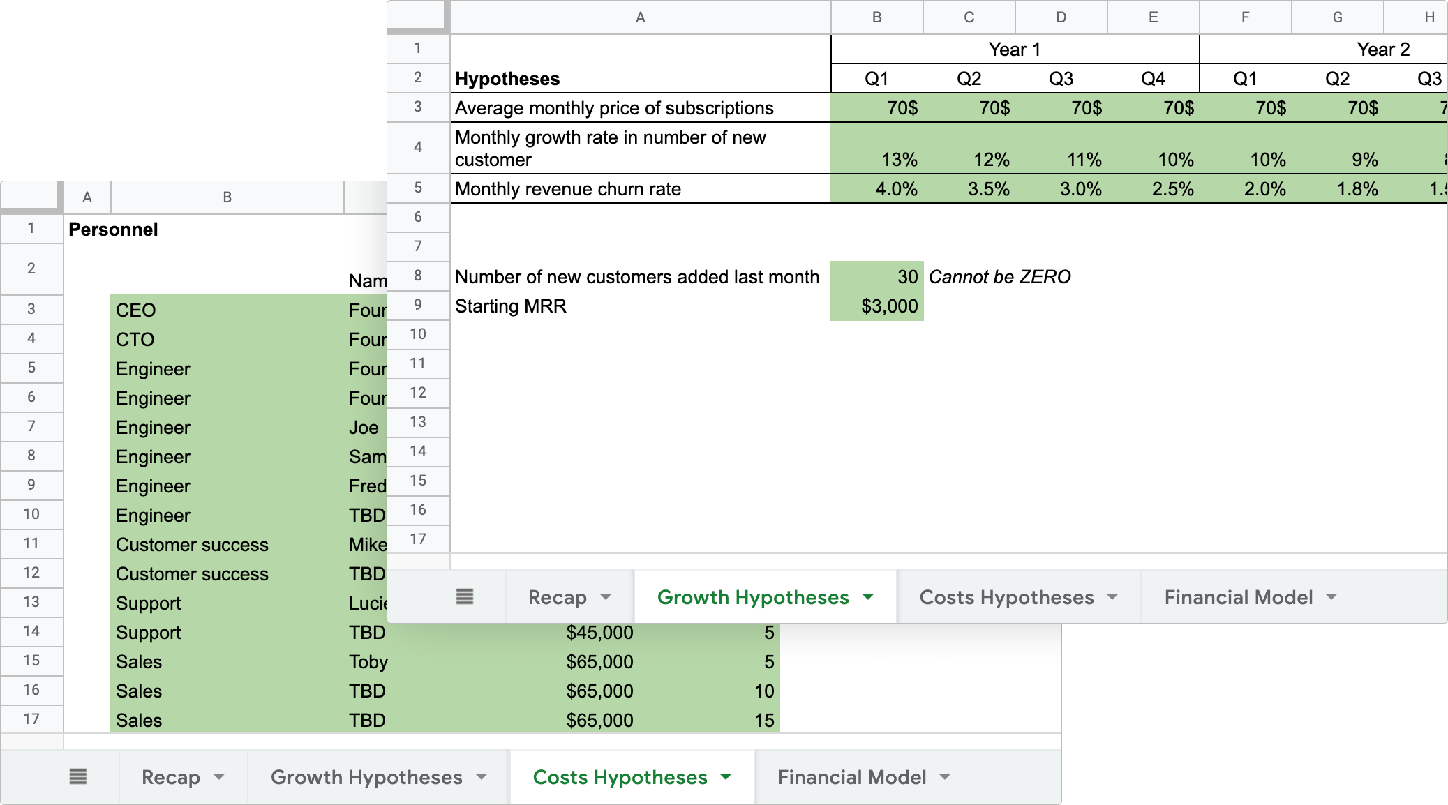 If you don’t know where to begin, start by changing something that you already know affects the variable you want to predict. For example, if you’re trying to predict how you could increase MRR, start playing with the monthly new customer growth rate.