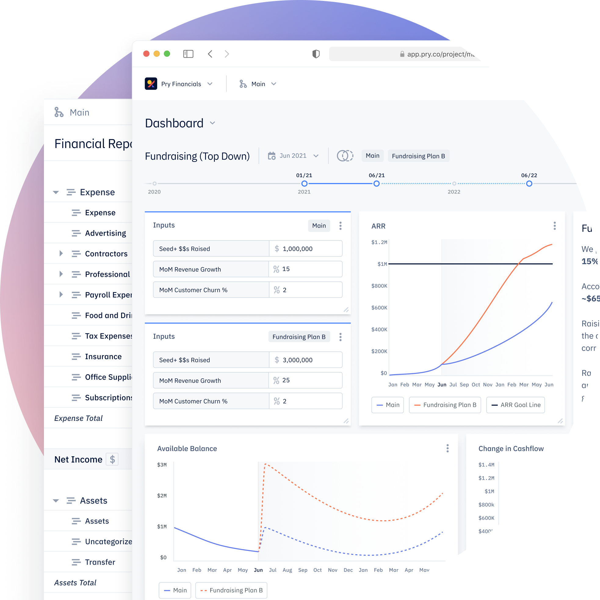 Pry’s Financial Projections does all of this calculating automatically, giving you a full picture of your finances at one glance. Plus, Pry tracks runway four different ways, so you can apply the right insights for your financial approach.